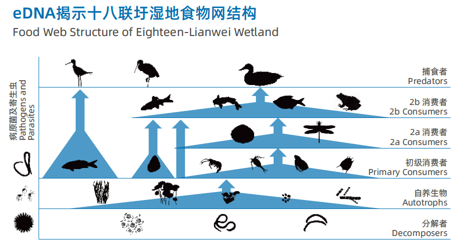 湿地最为重要的一个生态功能便是为野生动植物提供适宜的栖息地,我们将环境DNA 技术应用于湿地生物多样性监测,通过评价生物多样性及其组成的食物网结构,来进一步评价湿地的生态现状。