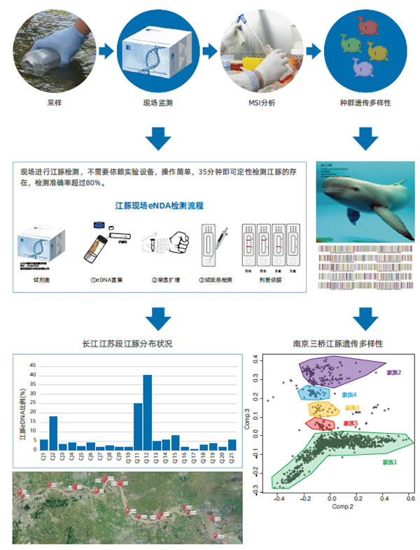 濒危物种是生物多样性保护的重点。丰富的遗传多样性是濒危物种维持生存的重要基础。长期以来,由于濒危物种数量少,对濒危物种的监测通常以数量调查为主,难以获得种群遗传信息,给物种保护带来很大限制。如今,环境DNA技术的进步为濒危物种的监测与保护带来新的曙光。我们对长江江苏段江豚分布状况采用环境DNA技术进行监测。江豚在长江中生存,不断向水中释放其自身的遗传物种,这些DNA片段不仅蕴含了江豚独特的身份信息,还蕴含了江豚种群的遗传多样性。环境DNA分析不仅能现场准确揭示江豚是否存在,还能通过江豚DNA中细微的序列差异评估江豚种群的大小和遗传多样性,为江豚的保护提供科学依据。