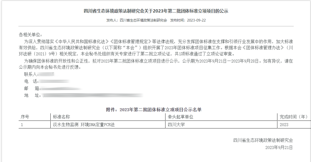 近日,我司联合四川大学、南京大学、四川省生态环境监测总站、中国科学院成都生物研究所、四川省环境政策研究与规划院、四川省生态环境科学研究院等单位向四川省生态环境政策法制研究会提出了《淡水生物监测 环境DNA定量PCR法》团体标准(以下简称“标准”)起草编制工作的立项申请,并于2023年9月19日顺利召开了立项技术审查会。