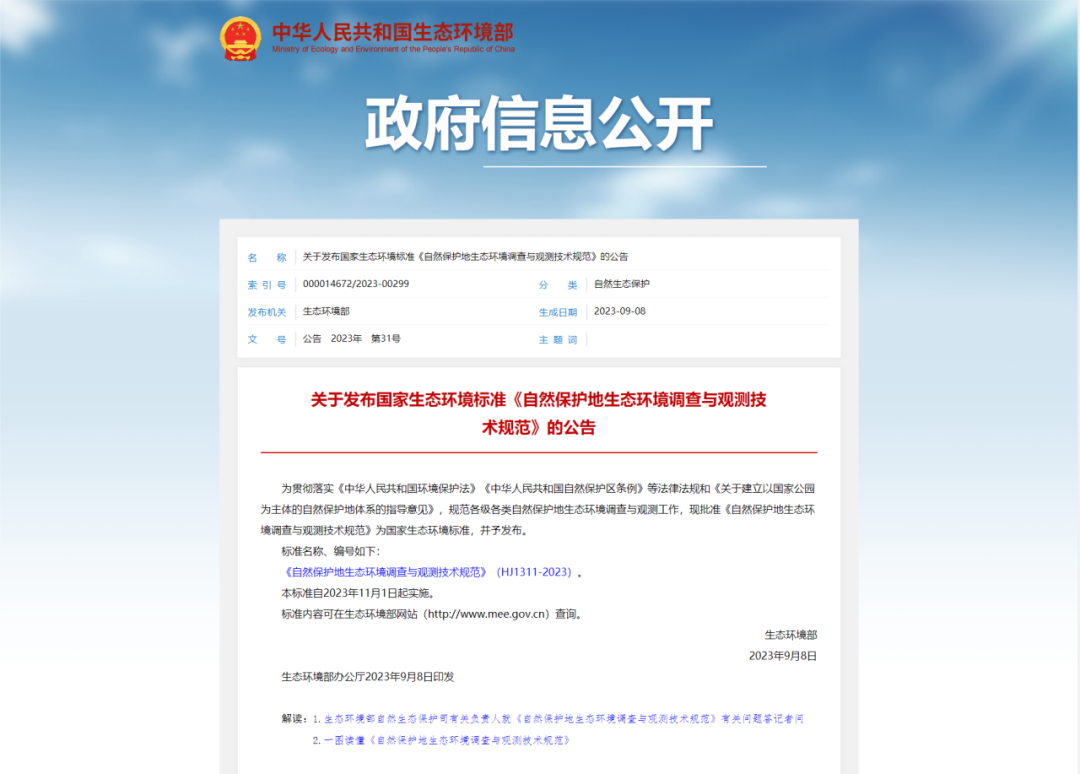 政策分享 | 生态环境部:自然保护地生态环境调查与观测技术规范,11月1日起实施,一起了解→