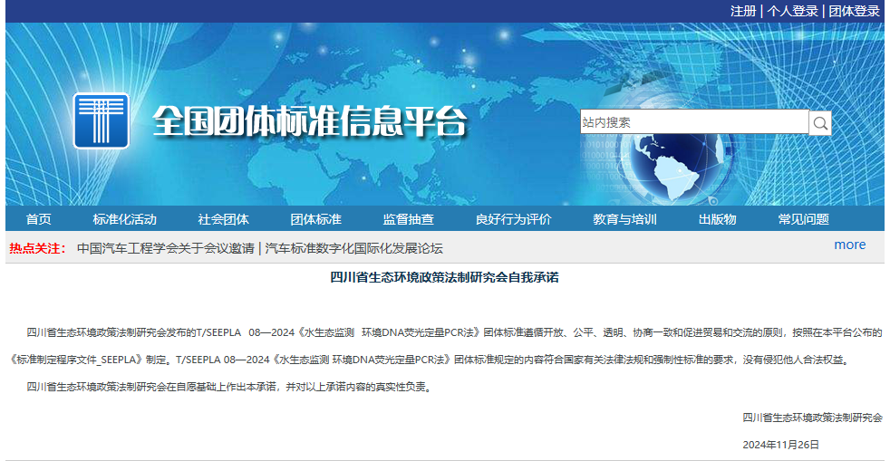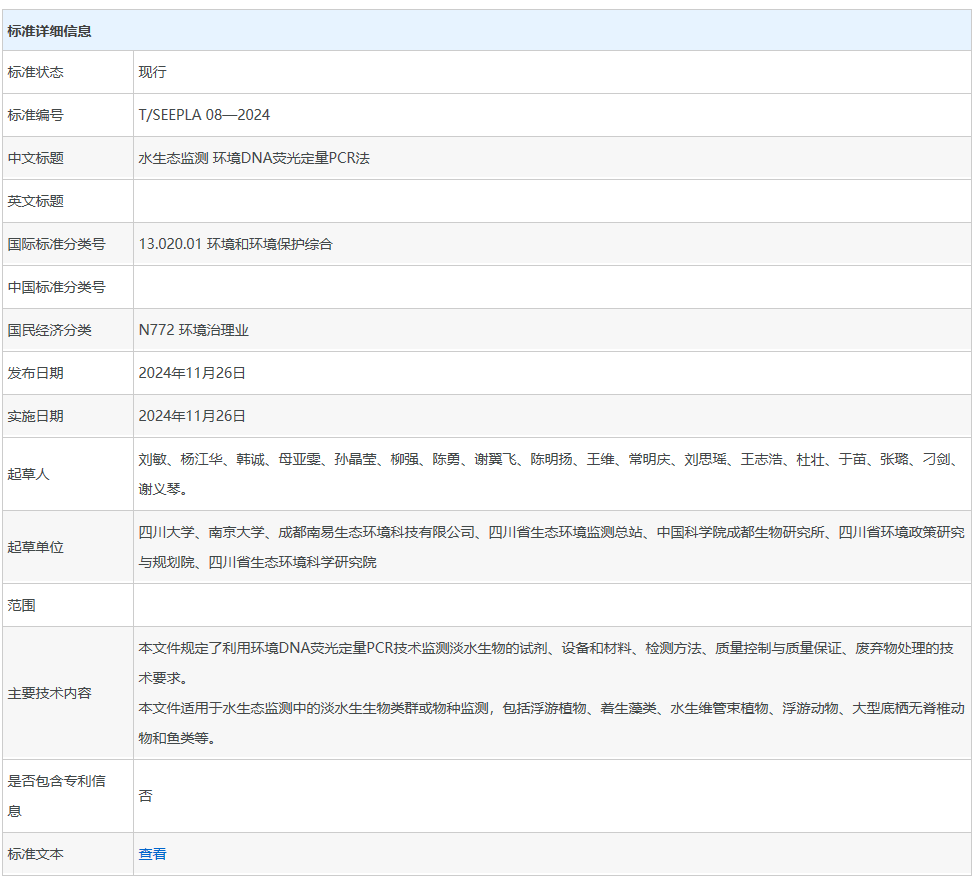 11月26日,我司主要参与编制的《水生态监测 环境DNA荧光定量PCR法》(T/SEEPLA 08—2024)团体标准由四川省生态环境政策法制研究会在全国团体标准信息平台正式发布(发布链接:https://www.ttbz.org.cn/StandardManage/Detail/122342/ ),并于2024年11月26日正式实施。