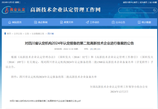 12月2日,全国高新技术企业认定管理工作领导小组办公室发布了《对四川省认定机构2024年认定报备的第二批高新技术企业进行备案的公告》,成都南易生态环境科技有限公司(以下简称“我司”)顺利通过国家“高新技术企业”认定!