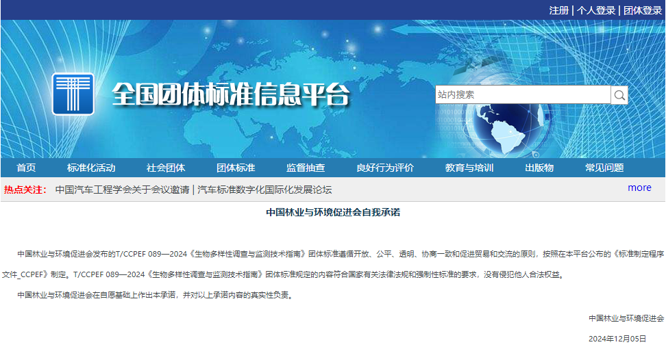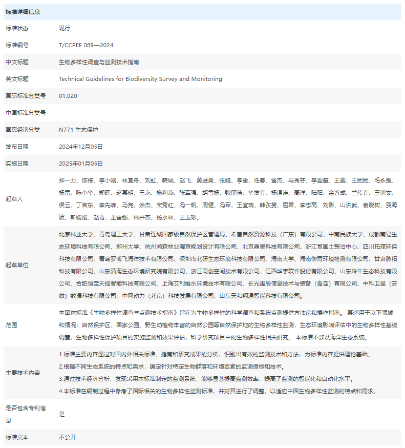 12月5日,我司参与编制的《生物多样性调查与监测技术指南 》(T/CCPEF 089—2024)团体标准由中国林业与环境促进会在全国团体标准信息平台正式发布,将于2025年01月05日正式实施。